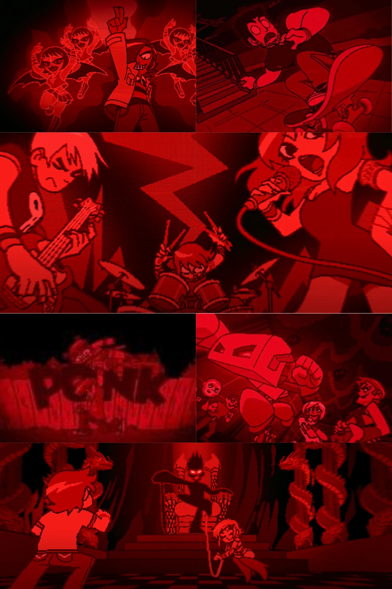 After Todd attacks Envy Adams, Scott whacks him with his bass guitar, intending to fight him one more time and defeat him. Todd accepts the challenge, summoning his own bass guitar. Todd and Scott proceed to face-off in a bass battle. Todd plays an incredible bass solo, and uses his vegan powers to knock Scott down. The Boys!! and Crash! appear to help Scott; having practiced so hard, their talents have now paid off and they can now manipulate pure sound waves through hard work and will power. They manage to hold off Todd’s powers, but he soon overpowers them, sending the group flying. Scott thinks to himself that Todd is too hard to defeat and he will need some kind of deus ex machina to help.