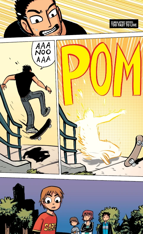 Lucas tells Scott that League almost didn’t accept him, but eventually did because of his grudge against Ramona. Hearing the word “league”, Scott asked what he meant, as he had paid little attention to it mentioned in Matthew’s email and letter. Lucas told him that “league” refers to the self-titled “League of Evil Exes”: the seven people Ramona had dated before him, thus keeping them organized enough to go after Scott one-by-one instead of ganging up on him. Lucas offers to let Scott go, in exchange for his money. Scott insults Lucas, prompting him to switch mood and attempt to kill him. Scott sees the place’s long winding staircase and, remembering Lucas’ history as a skater, Scott asks if he can perform a grind on the rails. Lucas initially refuses, pointing out the “2,000” stairs and rail quality, but goes for it after Scott questions the impossibility.