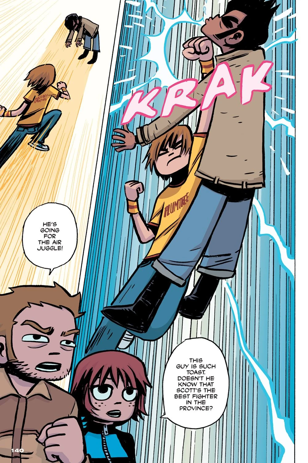 After hearing that Ramona’s next evil ex, Hollywood superstar/pro skater Lucas Lee was filming a new movie in Toronto, Scott went with Wallace to confront him at the movie set at the Casa Loma. Arriving there, Scott introduced himself, and Lucas walked up to him and casually punched him, before grabbing his legs and flinging him into one of the towers.