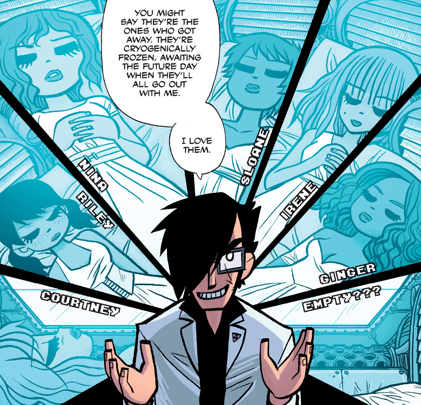 At first thought to be his own personal group of "Evil Exes" by Scott, Gideon's Ex-Girlfriends were considered "the ones that got away" by none other than Gideon himself. The girls are: Courtney, Riley, Nina, Sloane, Irene, Ginger, and Ramona. While Ramona was never added to his "collection," the other six are kept in a large hanging Cryogenic Freezer inside Chaos Theatre.