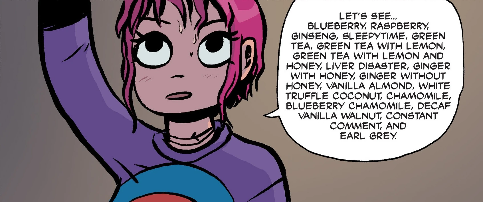 In Ramona Flowers's apartment is an entire cabinet dedicated to different types of tea. This surprises Scott, who asks, "There's more than one kind [of tea]?"