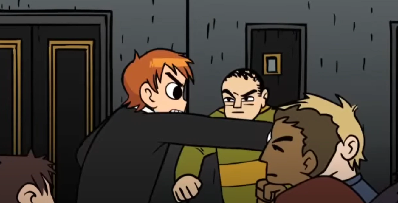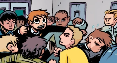 After missing the bus to school one day, Lisa Miller and Lauren Wood alerted Scott Pilgrim that Kim Pine had been kidnapped by the Benvie Boys. Arriving at Benvie Tech High School, Scott started fighting the Benvie Boys, and demanded to know the whereabouts of the group leader Simon Lee.