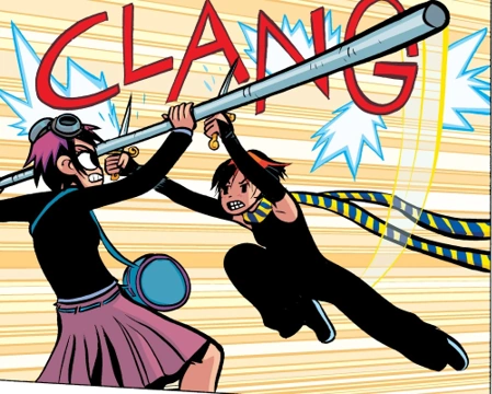 | Books | Gigs | Gig at Rivoli |Showdown at Benvie Tech High School | Lunchapalooza | Crusade against the League of Evil Exes | Battle at Club Rockit | Skirmish at Casa Loma | Skirmish at the Toronto Reference Library | Show at Lee's Palace | Skirmish at Lee's Palace | Skirmish at Honest Ed's | Fight with Envy Adams | Gig at Lee's Palace | Bass Battle | Encounter with Roxie Richter | Encounter with Mr. Chau | Ambush at The Happy Avocado | Battle in Subspace | Encounter at the Second Cup | Duel at Ramona Flowers' Apartment | Fight with Robot-01 | Gig at Sneaky Dee's | Fight with Unnamed Third Robot | Duel at Queen and Bathurst | Duel with Nega Scott | Skirmish at Chaos Theatre